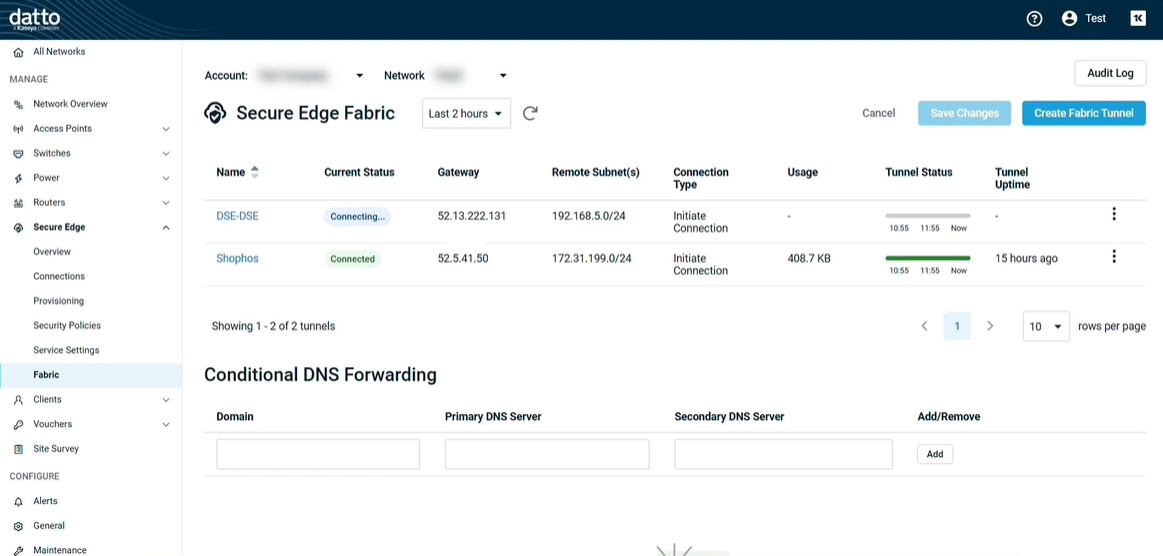 In Datto Network Manager, click Secure Edge in the Navigation menu, then select Fabric from the expanded options.
