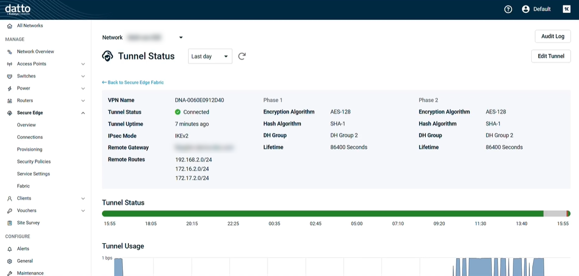 Selecting the tunnel name from the Fabric page will open the Tunnel Status page for that tunnel. This provides information on the configuration selected, the usage, logging, and status overtime. It can also be used to edit the tunnel using the Edit Tunnel option.