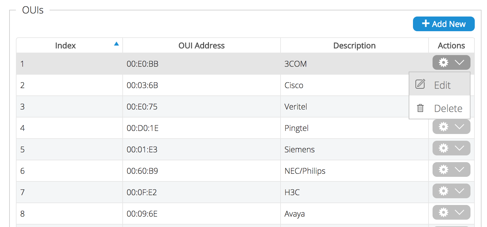 By default (and on factory reset) the switches come pre-configured with a set of 8 most common VoIP phone manufacturers. To edit or to remove any of the default ones, simply click on the action menu on the right end of each row: